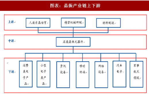 晶振属于电子类基础元器件,其上游产业包括石英培育、材料制造以及精密机械,下游应用包括资讯、有线、无线通讯、消费电子、网络、汽车等,
