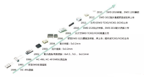 随着电子产品逐渐向小型化方向发展,各大晶振生产厂商不断推出更小型号产品。封装尺寸大小逐年下降。晶振封装尺寸由大到小有50*70mm、60*35mm、50*32mm、40*25mm、32*25mm、20*25mm、20*16mm、20*12mm、16*12mm等规格,目前主流应用SMD晶振规格为3225,而小型电子产品如智能手环已开始应用2012晶振。