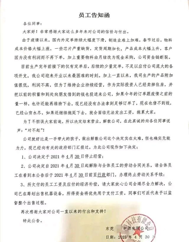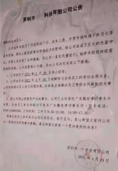 据深圳市某科技有限公司公告显示,由于成本压力增加、行业利润下滑、外贸市场恶化和新冠疫情的多方影响,该公司遭受巨大的负面冲击,一直负重前行。尽管采取了各种措施,始终未能扭转经营困境、经营难以为继,公司决定自2021年4月29日停止经营,4月30日起解雇佣全体员工。