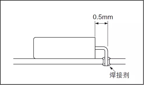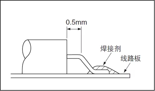 (1) 将导脚弯曲之后并进行焊接时,导脚上要留下离外壳0.5mm的直线部位。如果不留出导脚的直线部位而将导脚弯曲,有可能导致玻璃的破碎 (参阅图5和图6)。